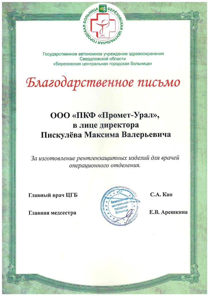 Руководство ГАУЗ СО «Березовская центральная городская больница» выразило благодарность Группе компаний Промет-Урал за изготовление и поставку комфортной рентгенозащитной одежды серии «Премиум» для врачей операционного отделения.
